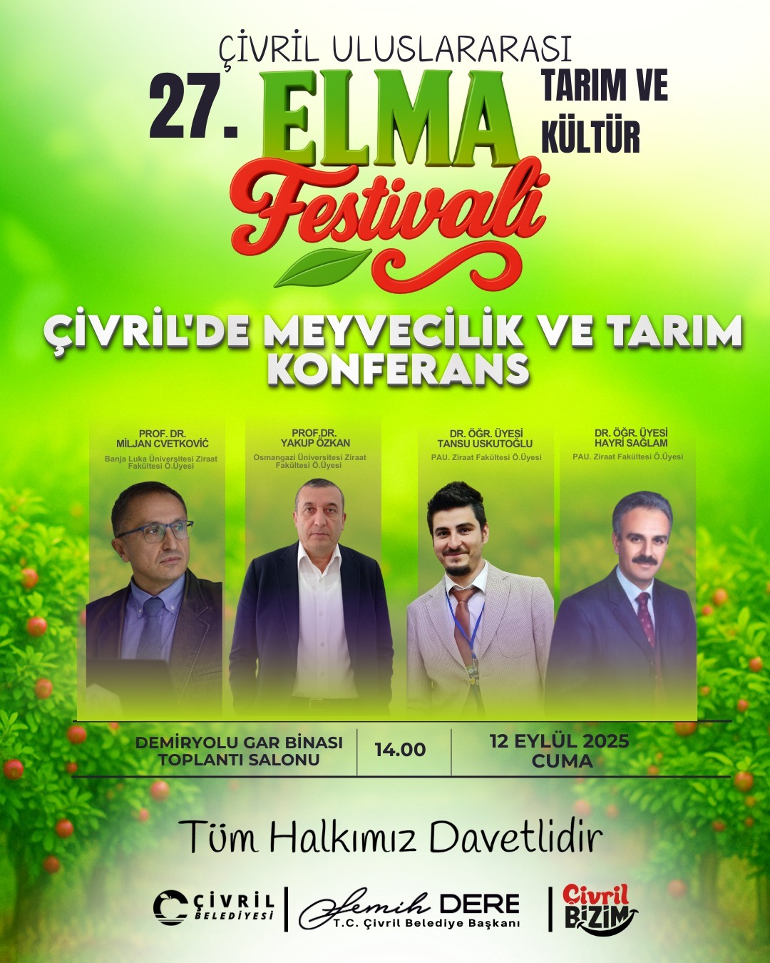 Bölüm Başkanımız Prof. Dr. Yakup ÖZKAN Denizli-Çivril de 11-14 Eylül 2025 tarihlerinde düzenlenen Festivalde Konferansa katılmıştır. Denizli Çivril'de, Çivril Belediyesi tarafından düzenlenen "Çivril Uluslararası 27. Elma Tarımı ve Kültür Festivali" nin 2. Gün programında "Elma Tarımı ve Meyvecilik Çalışmaları" üzerine Konferans düzenlenmiştir. Prof. Dr. Yakup ÖZKAN Konferans'ta Moderatör olarak görev almış ve "Modern Meyvecilik" konulu sunum yapmıştır. Festival programı içerisinde Çivril bölgesindeki üreticilere ait elma bahçelerinde teknik incelemeler yapılmıştır.